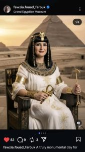 وظهرت الأميرة فوزية من خلال صورة لها وهي ترتدي الزي الفرعوني مستعينة بالذكاء الاصطناعي، وعبّرت عن فخرها واعتزازها بما تشهده مصر من إنجازات، تزامنًا مع افتتاح المتحف المصري الكبير، المقام حاليًا بحضور عدد من قادة العالم وكبار الشخصيات الدولية.