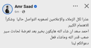 تعرض الفنان أحمد سعد، لحادث سير، وضحً شقيقه عمروعبر صفحته على “فيسبوك” صعوبة الرد على الاتصالات في الوقت الحالي، وموجهًا الشكر لكل من حاول الاطمئنان. وأكد أن أحمد سيكون بخير بإذن الله رغم صعوبة الحادث، داعيًا الجمهور إلى الدعاء لهما.