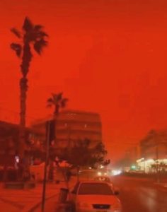 في مشهد بدا وكأنه خارج عن المألوف، ووصفه البعض بأنها نهاية العالم نظرا لتحول الجو فجأة إلى اللون الأحمر أو البرتقالي، حيث شهدت مناطق واسعة حول البحر الأبيض المتوسط وعلى رأسها جزيرة كريت اليونانية، ظاهرة جوية أثارت القلق بعدما تحولت السماء إلى درجات داكنة مائلة إلى الأحمر نتيجة عواصف غبارية كثيفة اجتاحت المنطقة والتي أطلق عليها اسم «العاصفة الدموية»،