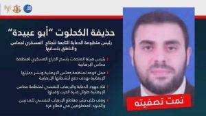 كما أعلن المتحدث باسم جيش الاحتلال السابق، أفيخاى أدرعى، اغتيال حذيفة الكحلوت، المعروف بـ«أبوعبيدة»، المتحدث باسم «كتائب القسام»، الجناح العسكرى لحركة حماس الفلسطينية.