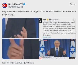 كما نقل التلفزيون الكوري الشمالي – غير الرسمي – مشاهد من الفيديو تبدو غير طبيعية، قائلًا: «هل هذا الفيديو لبنيامين نتنياهو مُولّد بالذكاء الاصطناعى؟. يبدو أن هناك شيئاً غير طبيعى فيه، فالحركات والصوت لا يبدوان طبيعيين تمامًا».تلفزيون كوريا الشمالية: هل فيديو بنيامين نتنياهو مُولد بالذكاء الاصطناعى؟