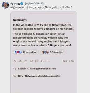 وترافقت هذه الادعاءات مع روايات أخرى تشير إلى أن الخطاب الأخير لنتنياهو ربما جرى إنتاجه باستخدام تقنيات الذكاء الاصطناعى؛ ما فتح باب الجدل حول صحة الفيديو المتداول وحقيقة ما يجرى تداوله عبر المنصات الرقمية.
